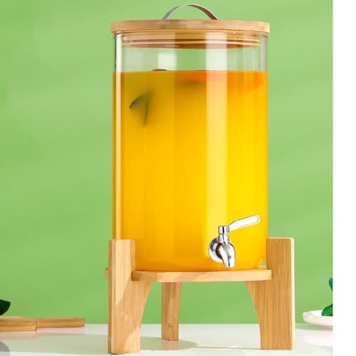 Drink Dispenser, 7L Glass Drink Dispenser with Stainless Tap, Beverage Dispenser with Bamboo Stand, Iced or Hot Beverage Dispenser for Parties,