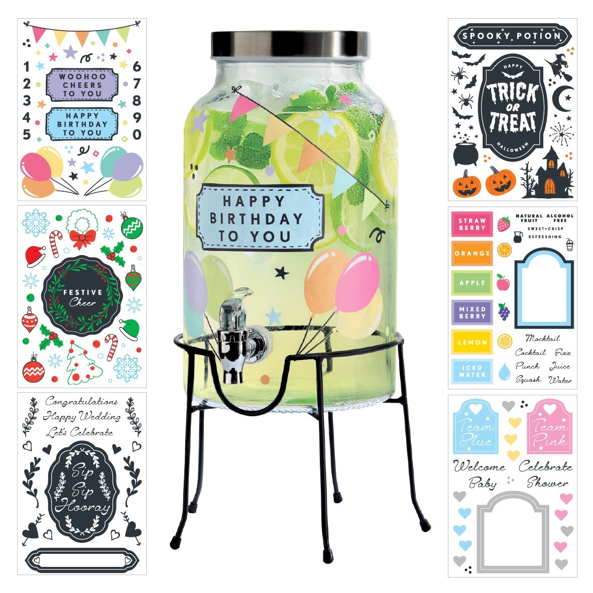 The Vintage Company Glass Drink Dispenser with Tap and Stand, 5.5L Capacity Water Dispenser, 6 Reusable Sticker Packs Included, Secure Screw Lid/Water, Juice, Cocktails, Parties (51009)