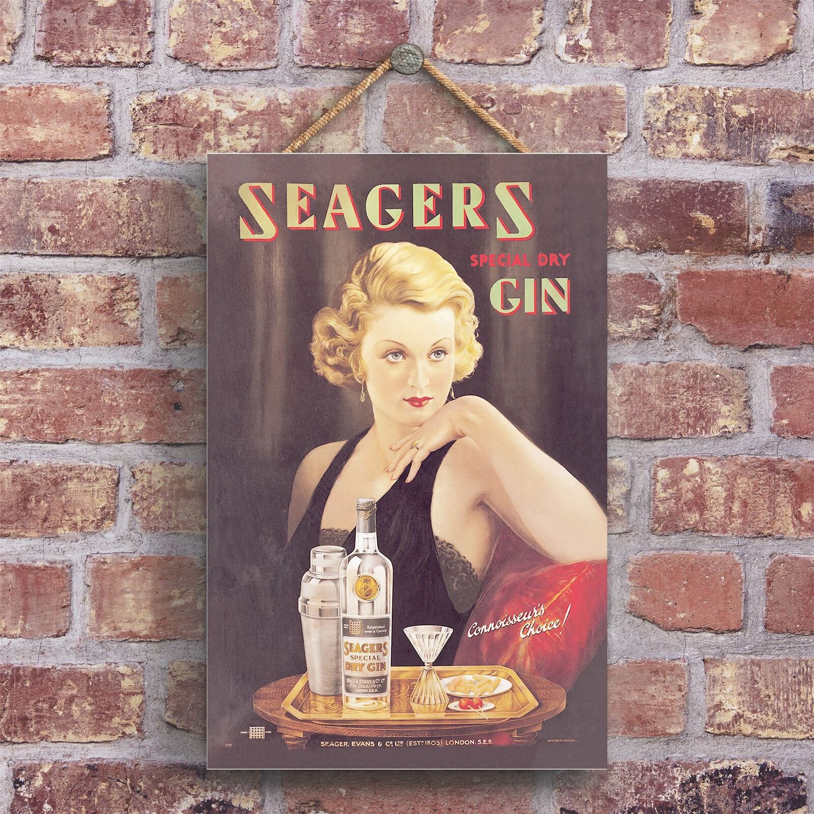 A CLASSIC SEAGERS SPECIAL DRY GIN VINTAGE AD ON A WOODEN PLAQUE