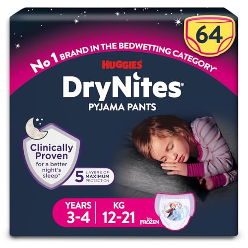 HUGGIES DryNites Pyjama Pants, Girl's 3-4 Years (12-21KG), 64 x Bedwetting Pants, Up to 100% Leak Free Nights