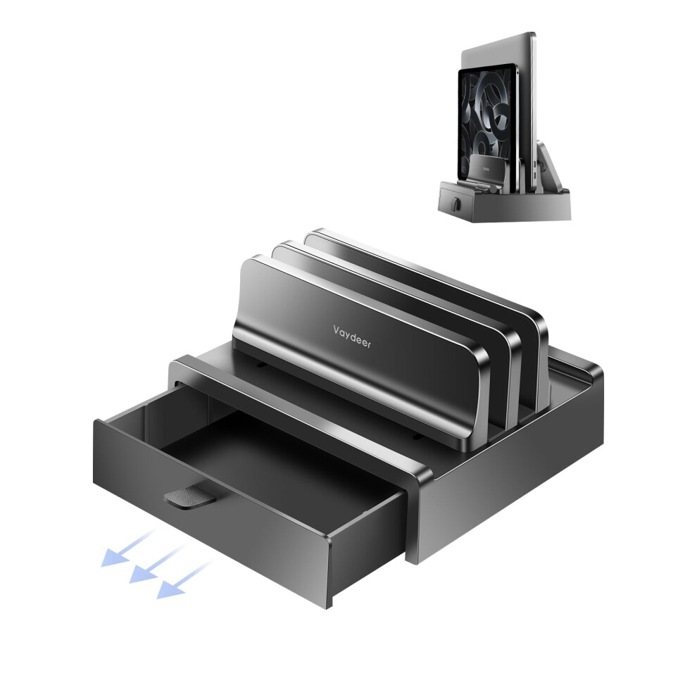 Dual Slot Vertical Laptop Stand with Builtin Drawer, Adjustable SpaceSaving Holder for Desk Organization, for MacBook and Dell
