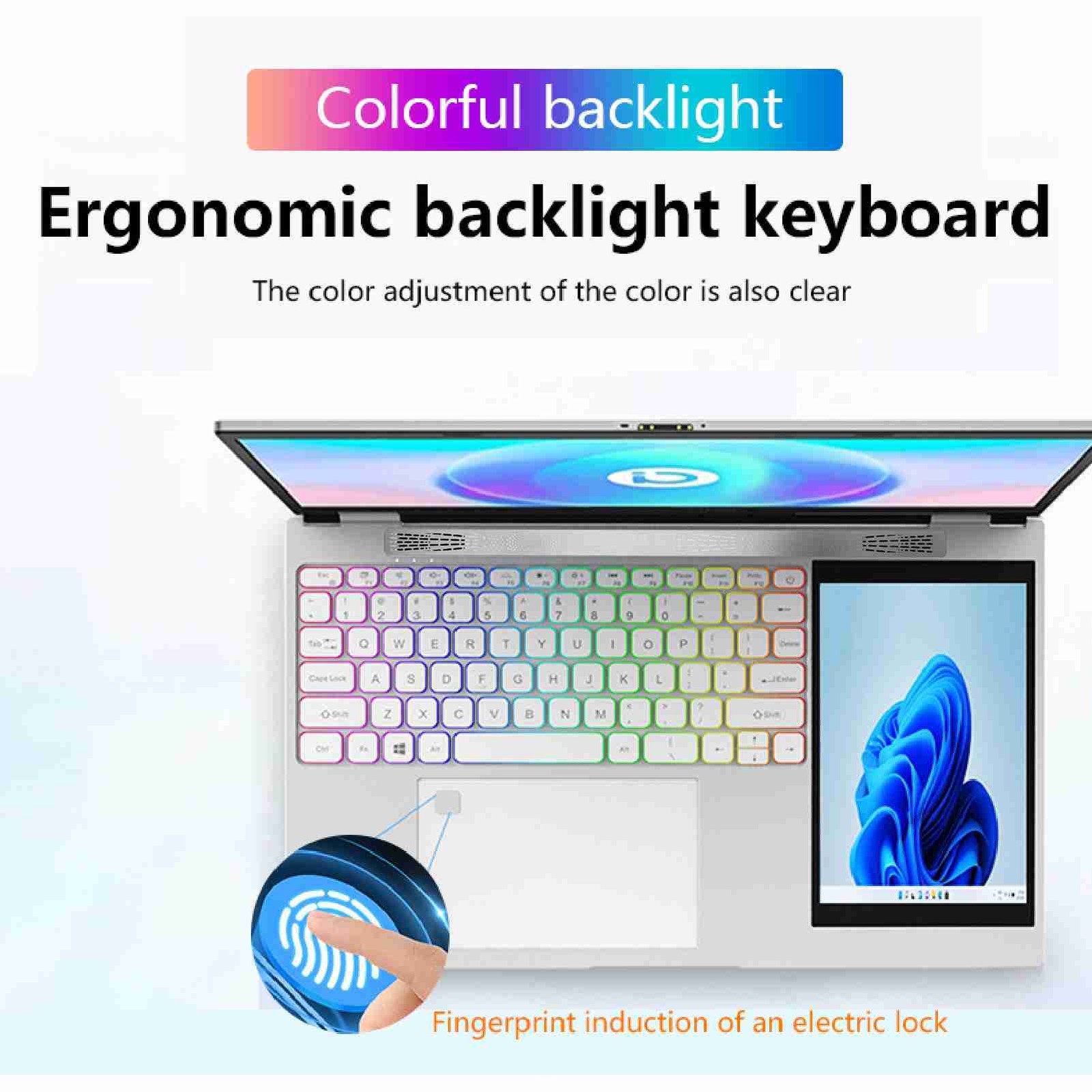 MeekRhynche Dual Screen Laptop N100, 15.6" FHD IPS + 7" Touch, 16GB DDR4, 512GB SSD, Windows 11 Pro, RGB Backlit, Fingerprint Unlock, Portable Mini PC for Work & Gaming