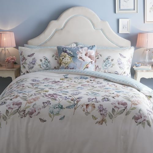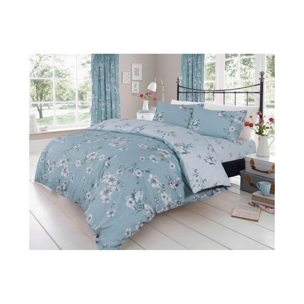 (Birdie Blossom Duck Egg, Double) Printed Duvet Cover Set Poly Cotton Reversible Bedding Single Double King Size