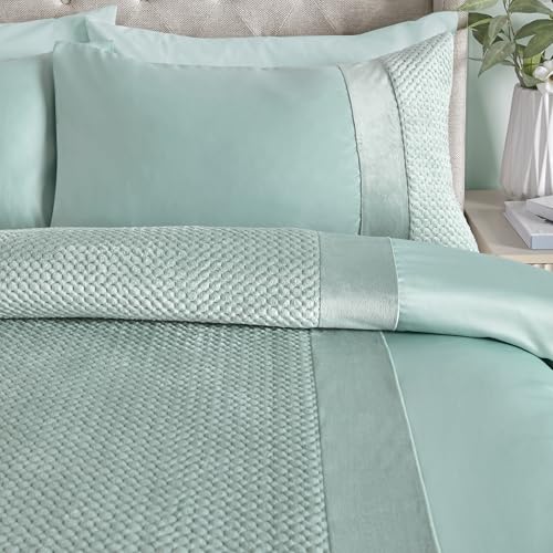 SOIREE Duck Egg Quilted Velvet Duvet Cover – Double 200x200cm – Satin Blend Bedding with Pinsonic Pattern – 2 Pillowcases – Luxury Duck Egg Bedding
