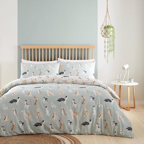Fusion - Duck Egg Blue Dog Duvet Cover - Single Bedding Size (140 x 200cm) - Reversible Design (Beige & Duck Egg Blue) - Paw Print Duvet Cover - Dogs Print Duvet - Shih Tzu, French Bull and Poodles