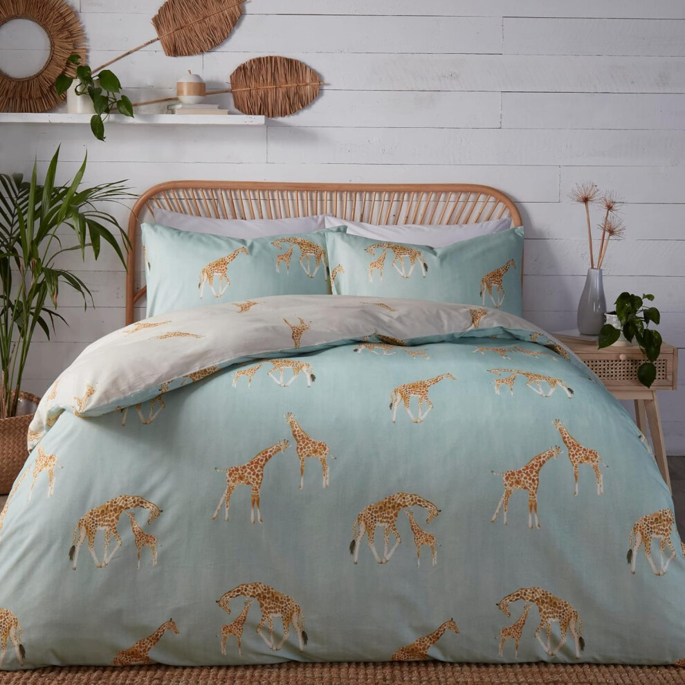 Fusion Duck Egg Blue Giraffe Duvet Cover Set – Double Size (200 x 200cm) – Reversible Zoo Animal Print – 100% Cotton – 2 Pillowcases – Fun Giraffe Bedding for Kids or Adults – Popper Closure