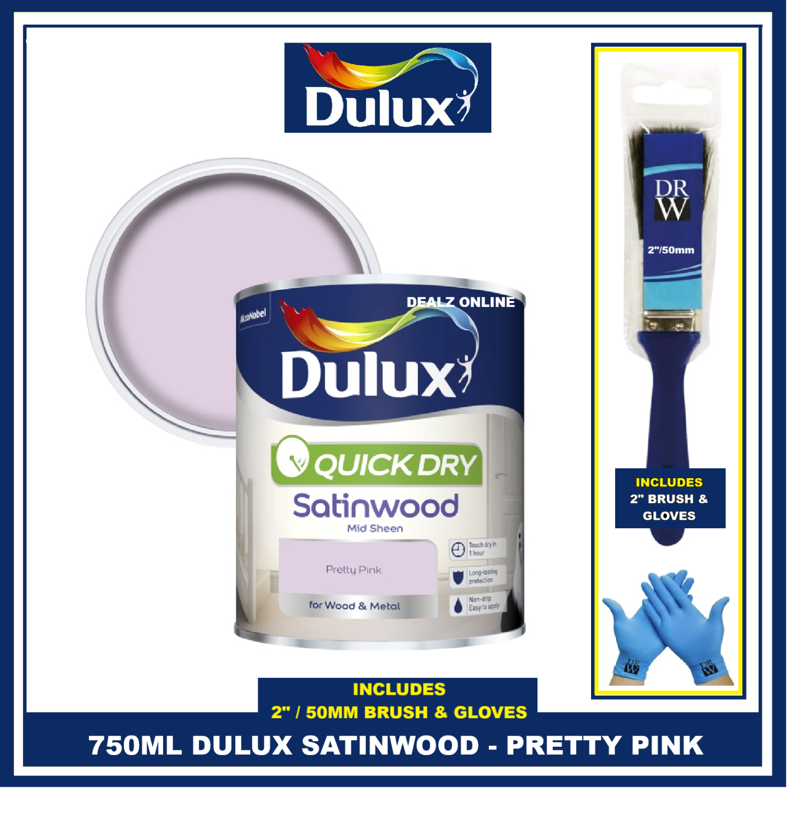 Dulux Quick Dry Pretty Pink 750ML Satinwood Wood/Metal Paint FREE BRUSH & GLOVES