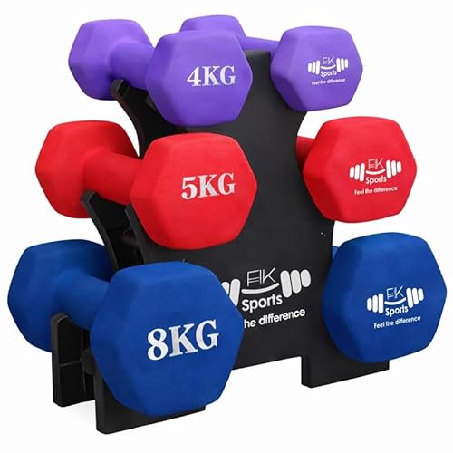FK Sports Neoprene Dumbbells Set with Stand Rack – Anti-Slip Hand Weights for Women & Men – Compact Dumbbell Storage Rack for Home Gym, Fitness, Aerobics & Strength Training (34KG Set)