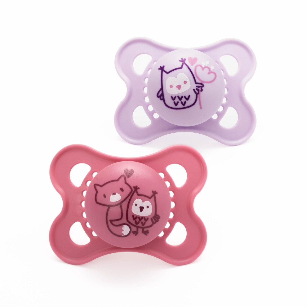 MAM Original Soothers | 0-6 Months | 2 Pack | Comes in Dummy Steriliser Case | Sustainable Materials | Baby Accessories for Newborn | Pink/Purple (Various Designs)