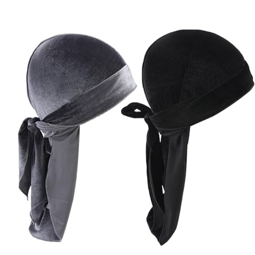 Tomtary 2 Pcs Velvet Durag For Men, Long Tail Durags Luxury Durag Mens Black and Grey Do Rag for Dreadlocks 360 Waves Curl
