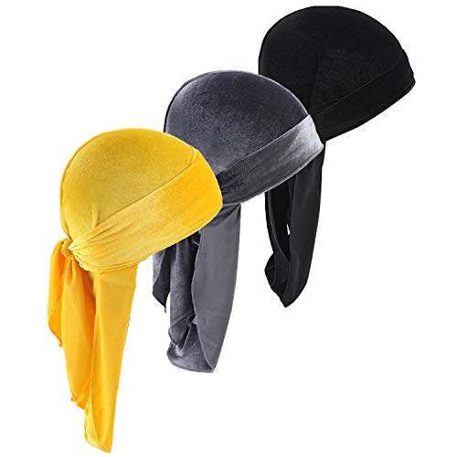 Durags Doo Rag Dew Rags for Men 360 Waves 3Pack Velvet Durags Headwear Skull Hat Headwraps for Men Women, 3c, One Size
