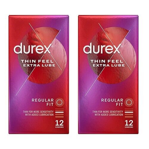 Durex Thin Feel Extra Lube Condoms, Regular Fit, 12 Pack, Secure Natural Latex,