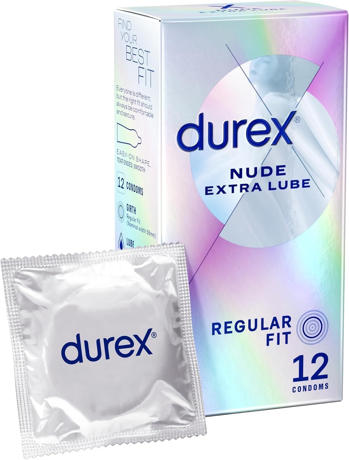 Durex Nude Extra Lube, Regular Fit, 12 Pack, Ultra Thin, Designed to Feel It Al