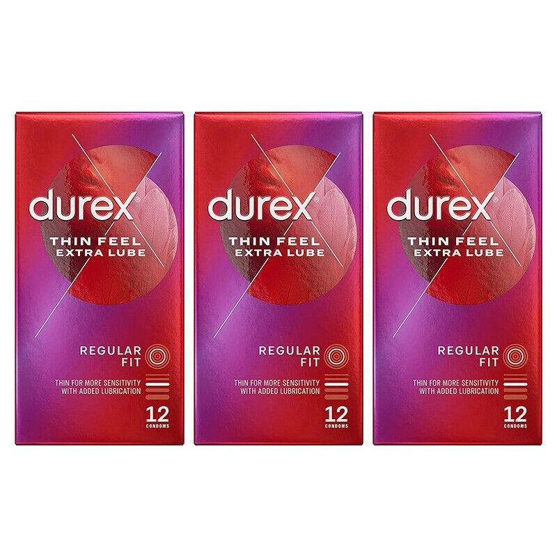 Durex Thin Feel Extra Lube Condoms, Regular Fit, 12s, Secure, Natural Latex, with Silicone Lube, Easy On Shape, More Sensitivity