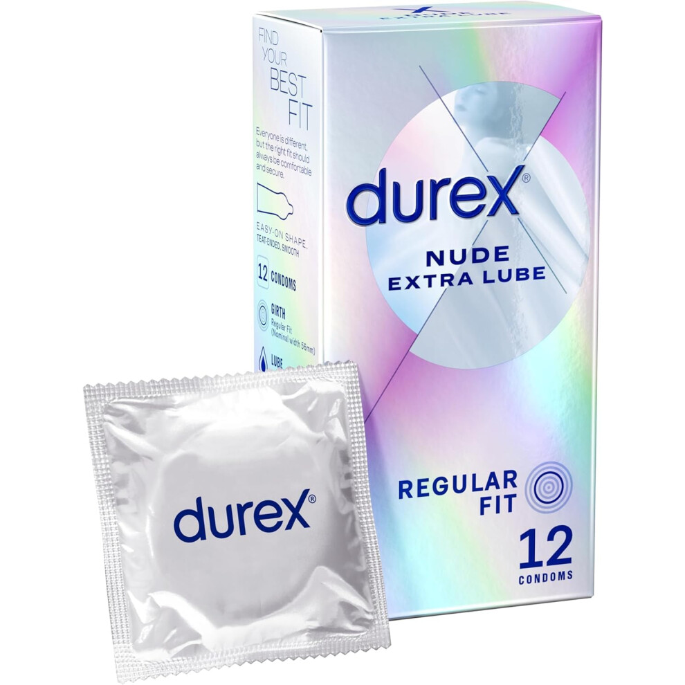 Durex Nude Extra Lube, Regular Fit, 12 Pack, Ultra Thin, Designed to Feel It All, Extra Lubrication, Silicone Lube, Easy On Shape