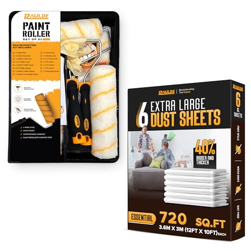 21 Pcs Paint Roller Set with 6X Large Dust Sheets for Decorating – Complete Painting Kit with Rollers, Brushes, Trays, Masking Tape & Plastic Sheets for Walls, Ceilings & Furniture Protection