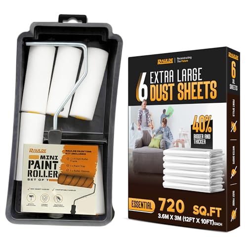 7 Pcs Paint Roller Set with 10x Large Dust Sheets – Complete Painting Kit with Rollers, Brushes, Trays, Masking Tape & Plastic Sheets for Walls, Ceilings & Furniture Protection