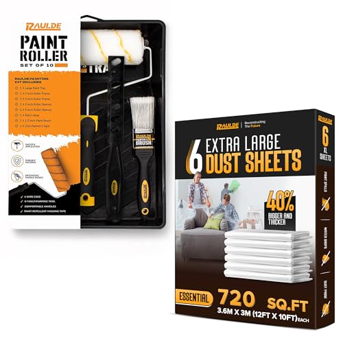 10 Pcs Paint Roller Set with 10x Large Dust Sheets – Complete Painting Kit with Rollers, Brushes, Trays, Masking Tape & Plastic Sheets for Walls, Ceilings & Furniture Protection