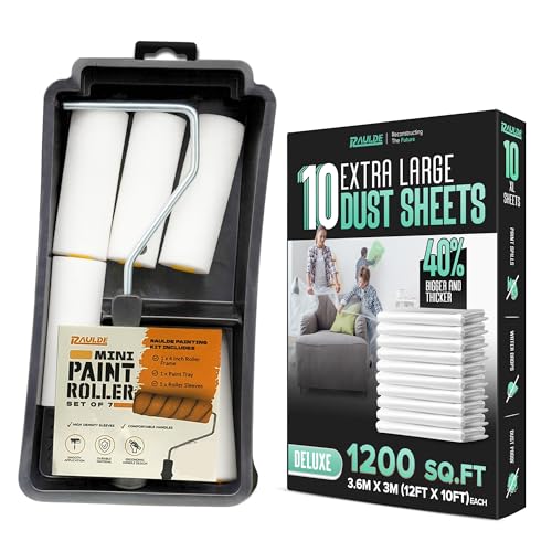 7 Pcs Paint Roller Set with 10x Large Dust Sheets – Complete Painting Kit with Rollers, Brushes, Trays, Masking Tape & Plastic Sheets for Walls, Ceilings & Furniture Protection