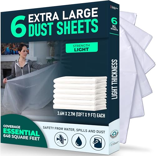 ARVO 6 Pack Extra Large Plastic Dust Sheets for Decorating - 3.6m x 2.75m (12ft x 9ft), Waterproof Polythene for Painting, Furniture, Floor Protection, Ideal with Paint Coveralls, Packaging May Vary