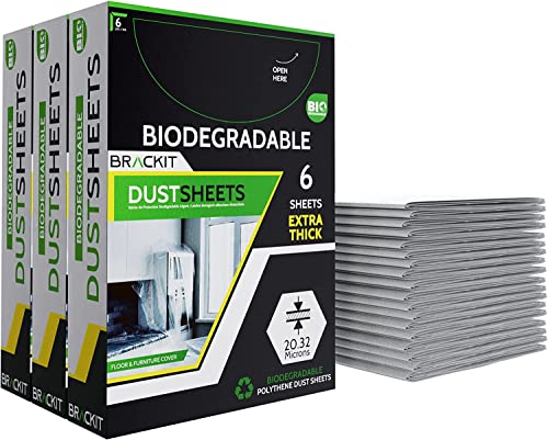 Brackit 6-Pack Biodegradable Large Plastic Dust Sheets for Decorating - 2.7m x 3.6m (12ftx 9ft) - 20 Micron - Embossed White Sheets for Painting - Waterproof Plastic Sheets for Painting & Covering
