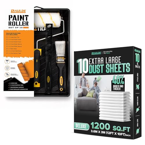10 Pcs Paint Roller Set with 10x Large Dust Sheets – Complete Painting Kit with Rollers, Brushes, Trays, Masking Tape & Plastic Sheets for Walls, Ceilings & Furniture Protection