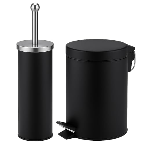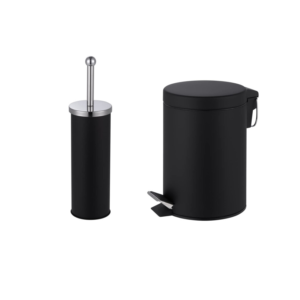 iTrend 3L Pedal Dustbin and Toilet Brush with Holder set - Bathroom Accessory - Powder Coated Steel Bin with lid - Toilet Brush with Stainless Steel Handle, Round Lid and Dense Bristles - Black