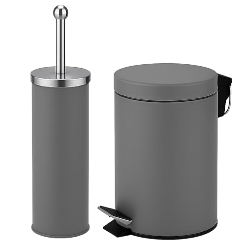 iTrend 3L Pedal Dustbin and Toilet Brush with Holder set - Bathroom Accessory - Powder Coated Steel Bin with lid - Toilet Brush with Stainless Steel Handle, Round Lid and Dense Bristles - Grey