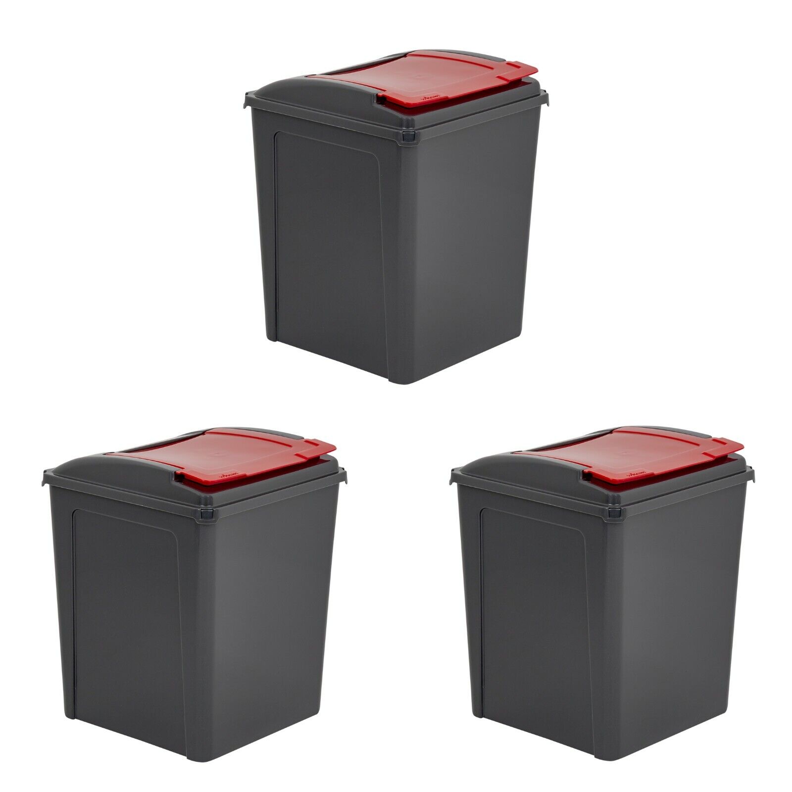 3 x Large 50L Plastic Recycle Bin with Red Flap Lid Waste Rubbish Dustbins U.K.
