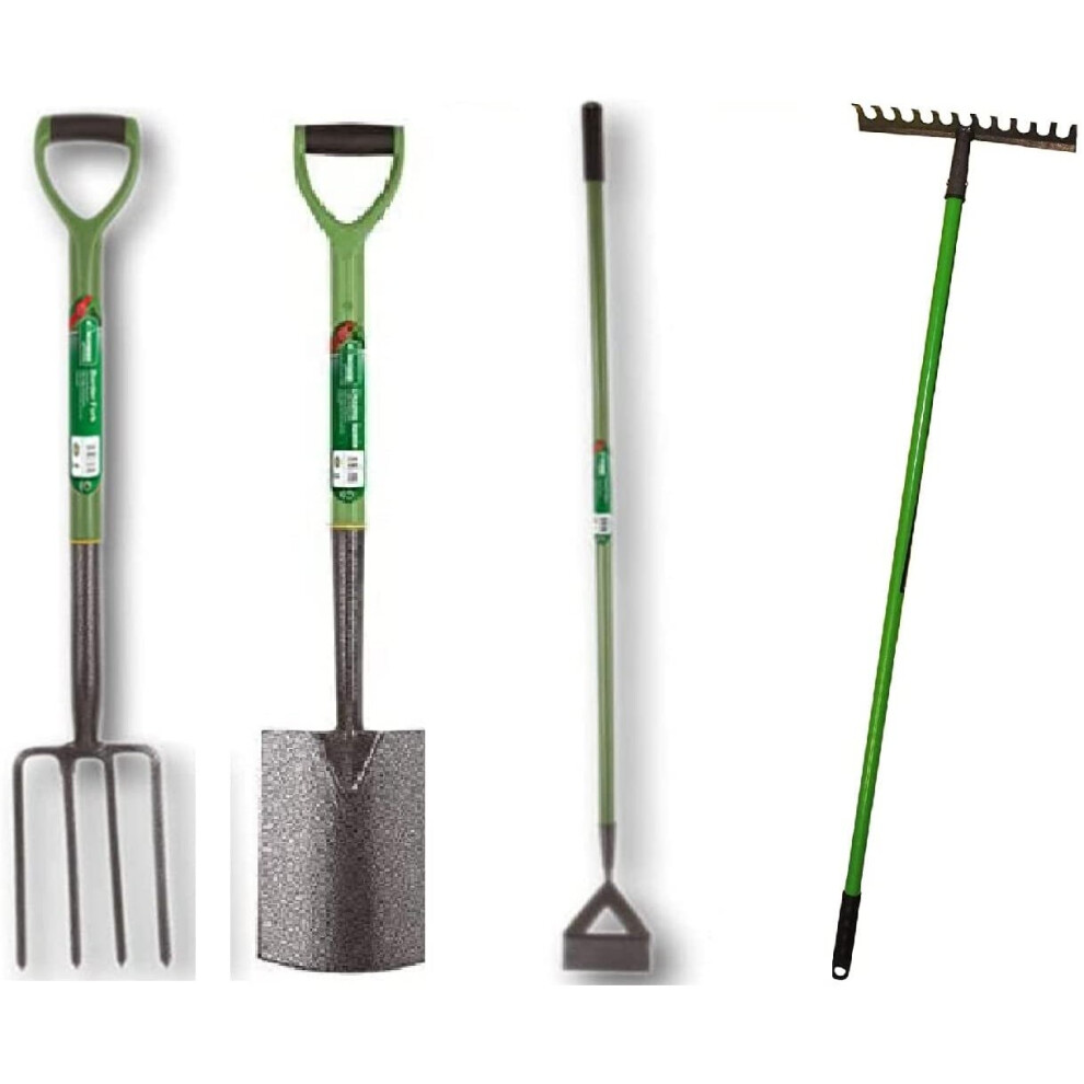 (Set of 4 Fork, Spade, Rake & Dutch Hoe) Garden Tools Lightweight Soft Plastic Handle Grip