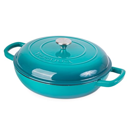 nuovva Shallow Cast Iron Casserole with Lid – Non Stick Dutch Oven Pot, Oven Safe up to 500° F – Sturdy Ovenproof Stockpot Cookware – Enamelled Cooking Pot – Teal, 3.7-Quart, 30cm – by Nuovva