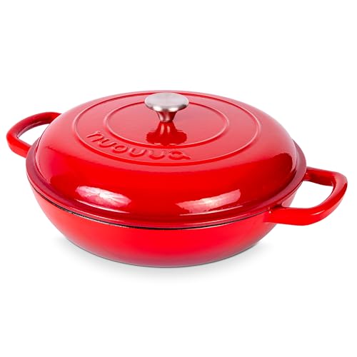 Shallow Cast Iron Casserole with Lid – Non Stick Dutch Oven Pot, Oven Safe up to 500° F – Sturdy Ovenproof Stockpot Cookware – Enamelled Cooking Pot – Red, 3.7-Quart, 30cm – by Nuovva