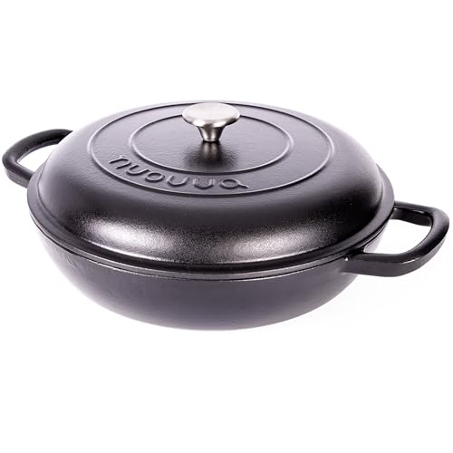 Shallow Cast Iron Casserole with Lid – Non Stick Dutch Oven Pot, Oven Safe up to 500° F – Sturdy Ovenproof Stockpot Cookware – Enamelled Cooking Pot – Black, 3.7-Quart, 30cm – by Nuovva