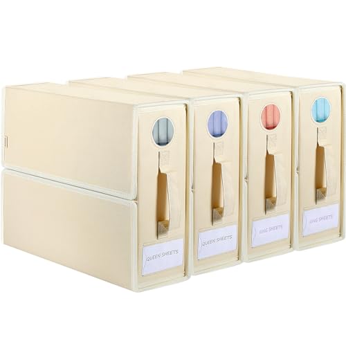 Voova 4 Pack Foldable Bed Sheet Organiser Storage, Folding Bedding Organizer Box with Clear Window and Zip for Sheets, Duvet Covers, Blankets, Pillows, Clothes and Towels(Queen & King Size), Apricot