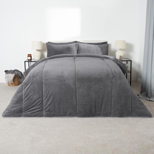 OHS 10.5 Tog Coverless Duvet Single Teddy Fleece Grey Bedding Set, Summer/Winter Duvet Quilt Covers Bedding Single Coverless Duvets with Pillowcase, Charcoal Grey