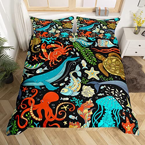 Loussiesd Sea Animals Duvet Cover Set Double Size 3D Print Aquarium Bedding Set Cute Colorful Ocean Marine Life Luxury Microfiber Polyester Comforter Cover with 2 Pillow Shams, Zipper, 3 Pcs