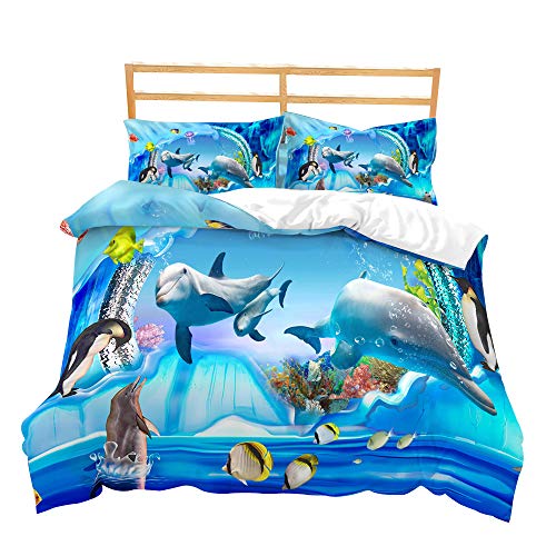 Loussiesd 3D Dolphin Print Duvet Cover Set Double Size Sea Animals Bedding Set Blue Ocean Underwater World Decorative Soft Microfiber Comforter Cover with 2 Pillow Shams, Zipper, Cute Vivid 3 Pieces