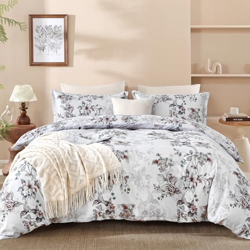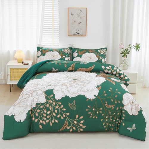 STYHO 3 Pieces Floral Duvet Set Double Size Green Large Flower Bedding Set with Pillowcases Soft Luxury Rustic Botanical Duvet Cover Set for Women Adults(Green, Double)