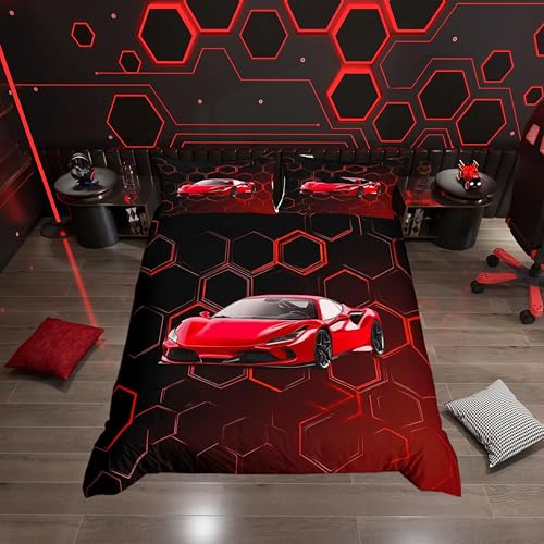 Loussiesd Red Race Car Duvet Cover Set Double Size For Kids Boys Teens Bedroom Geometric Honeycomb Bedding Set Hexagonal Speed Sports Car Duvet Cover with 2 Pillowcases Racing Bed Sets