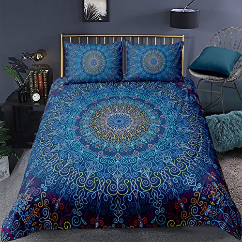 Loussiesd Mandala Duvet Cover Set Double Size Bohemian Boho Bedding Set Ethnic Exotic Floral Print Bedding Set Blue Mandala Flower Bedspread Cover Microfiber Quilt Cover Ultra Soft Zipper Closure