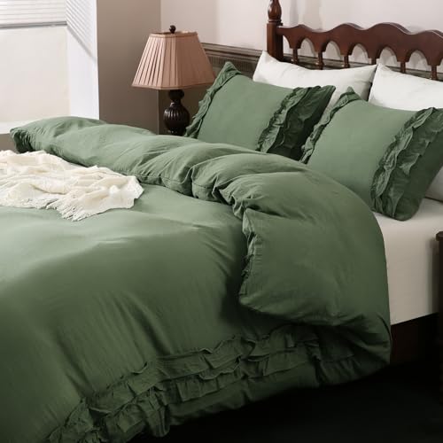 Herside Olive Green Duvet Cover Set Double Size 2 Layers Ruffled Design Farmhouse Boho Bedding Cover All Season Microfibre Bedding Set for Adult Men Girls