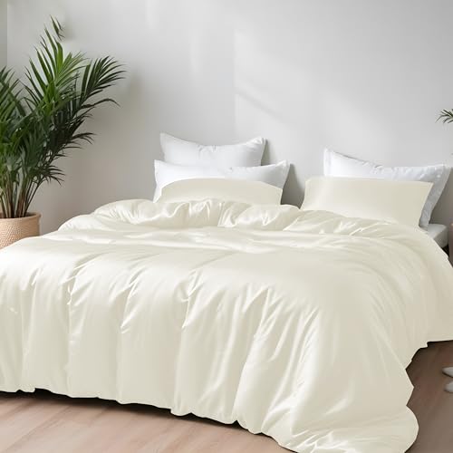 LINENWALAS Duvet Cover Set Double Size, 100% Bamboo Bedding 3 Piece Cooling Comforter Cover 200x200 cm Soft, Anti Allergy Thermo regulating Lightweight Silk Quilt Cover (Double, Ivory/Off- White)