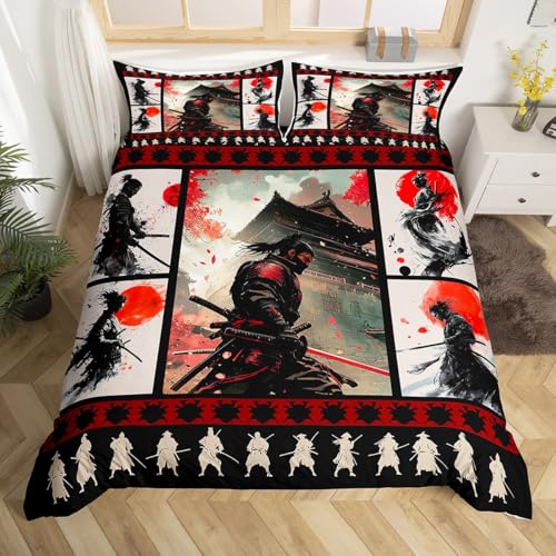 Loussiesd Japanese Samurai Duvet Cover Set Double Size Sunset Bedding Set Kids Boys Girls Japanese House Vintage Building Duvet Cover with 2 Pillowcases