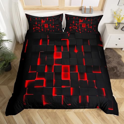 Loussiesd Light Honeycomb Duvet Cover Set Double Size For Kids Boys Teens Men Red Black Geometric Bedding Set Modern Art Comforter Cover with 2 Pillowcases Geometrical Luxury Beds Set