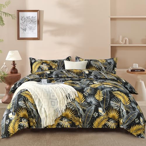 DJY Palm Duvet Cover Set Double Size - Tropical Palm on Black, 3-Piece Microfiber Floral Bedding Set - Wrinkle-Resistant & Breathable Design with Hidden Zipper (Double, 200x200cm)