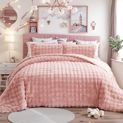 Herside Super Soft Pink Duvet Cover Set Double Size Rabbit Fur Bedding Set Lightweight&Berathable Spring Duvet Cover Faux Fur Quilt Cover 3 Pcs Pastel Pink Comforter Cover for Girls Teens Gift