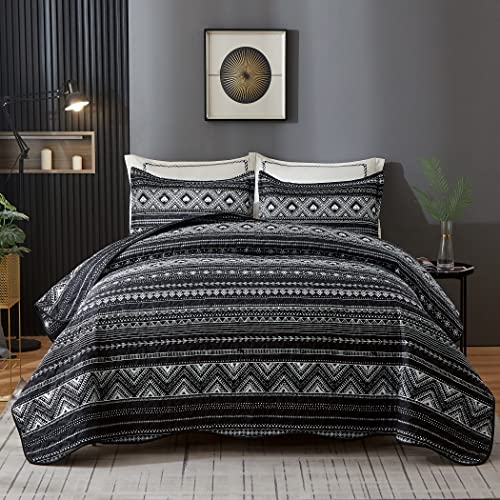 LAMEJOR Duvet Cover Set Double Size Black Geometric Pattern 3 Piece Lightweight Bedspread Comforter Set Microfiber