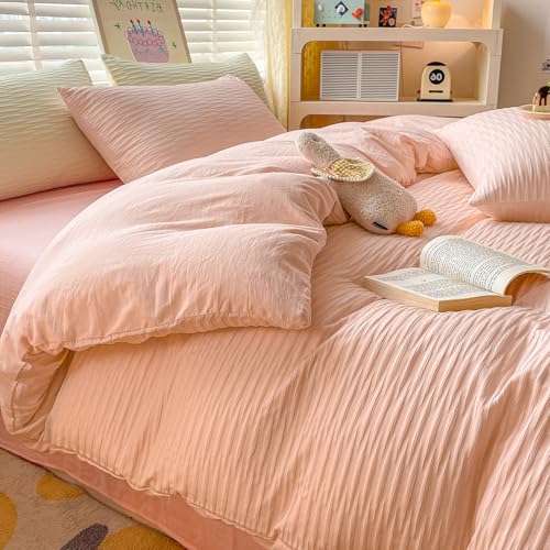 Seersucker Duvet Cover Set Double Size Beddding Set with Pillowcases for Teens Adults Soft Microfiber Polyester Seersucker Bedding, Pink, 200x200cm