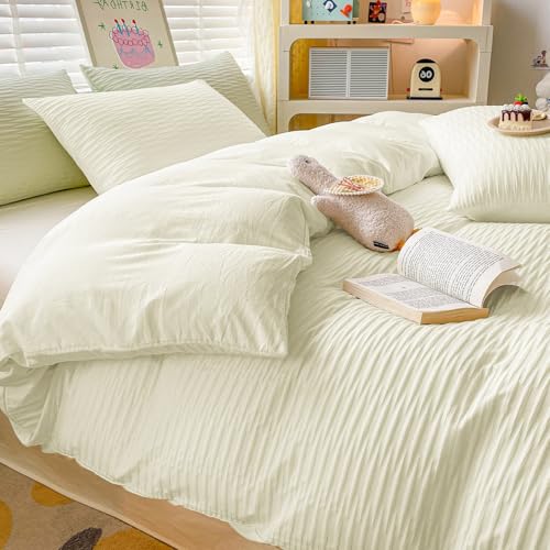 Seersucker Duvet Cover Set Double Size Beddding Set with Pillowcases for Teens Adults Soft Microfiber Polyester Seersucker Bedding, Cream White, 200x200cm