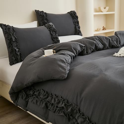 Herside Dark Grey Duvet Cover Set Double Size Cute Ruffle Bedding Set Shabby Chic 2 Layers Ruffled Design Boho Farmhouse Bedding Cover with Zipper Closure